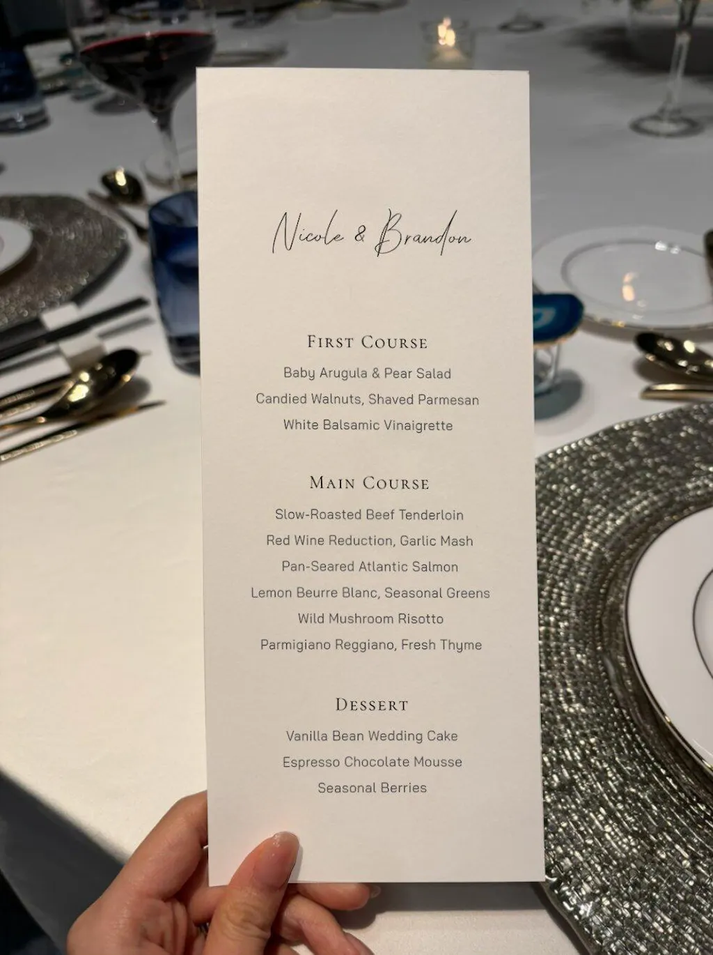 This wedding menu is designed with the couple’s names as the focal point, allowing typography and spacing to carry the composition. Without decorative headers or symbolic elements, the layout remains calm and intentional—placing emphasis on clarity, balance, and quiet presence at the table.